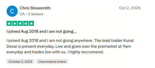 Chris Shoesmith joined in 2018 and has stayed ever since. He highlighted that I am present every single day, live, going over the pre-market at 9 AM and trading live with the community.