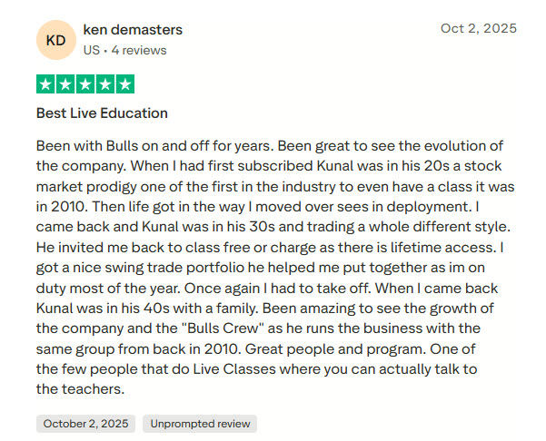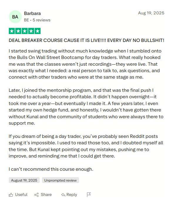 Yes. Bulls on Wall Street has been operating since 2008 with over 7,000 students, 445+ verified Trustpilot reviews at a 4.6 rating, and has been featured in Forbes, Fortune, and Inc. The lead instructor Kunal Desai trades live every market day in front of students and has been trading since 1999.