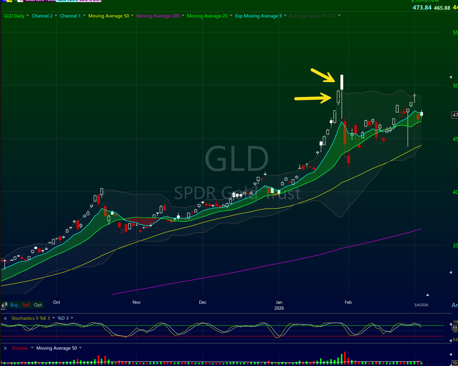 What is the biggest risk when shorting a parabolic stock? Getting in too early. Parabolic stocks can extend far beyond what logic suggests. The stock that looks overdone at $50 can go to $100 before it collapses. Using small test positions, defined stops over the high of day, and taking multiple tranches rather than one big bet protects you from this. This setup often takes 2 or 3 tries before you nail it. Look at Gold end of January 2026. It was overbought for days and then had 2 more days outside the upper bollinger band before it dumped hard.