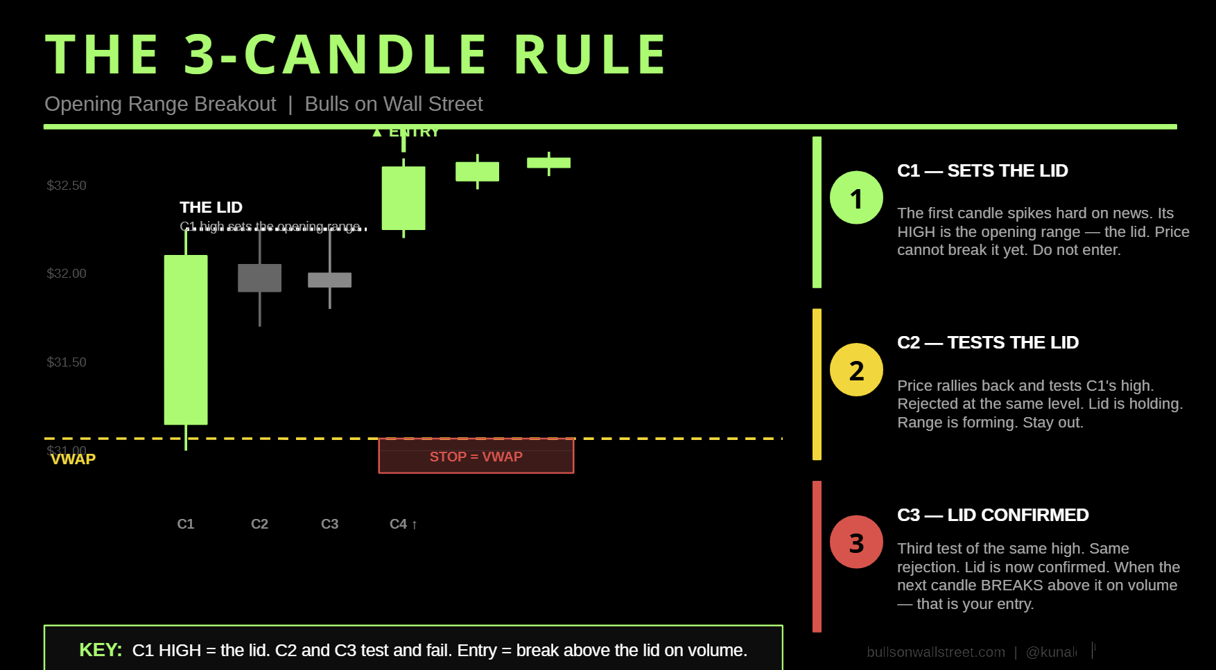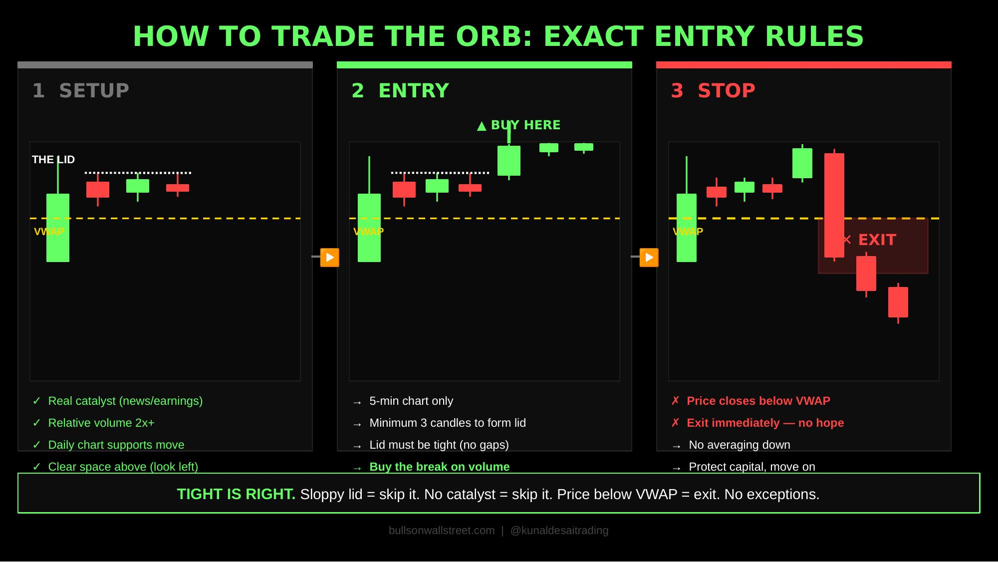 Three candles minimum. Lid must be tight. Entry on the break. Stop at VWAP. 5-minute chart only. 9:30 to 11:00 AM only. That is the system. Follow it or do not trade it at all.