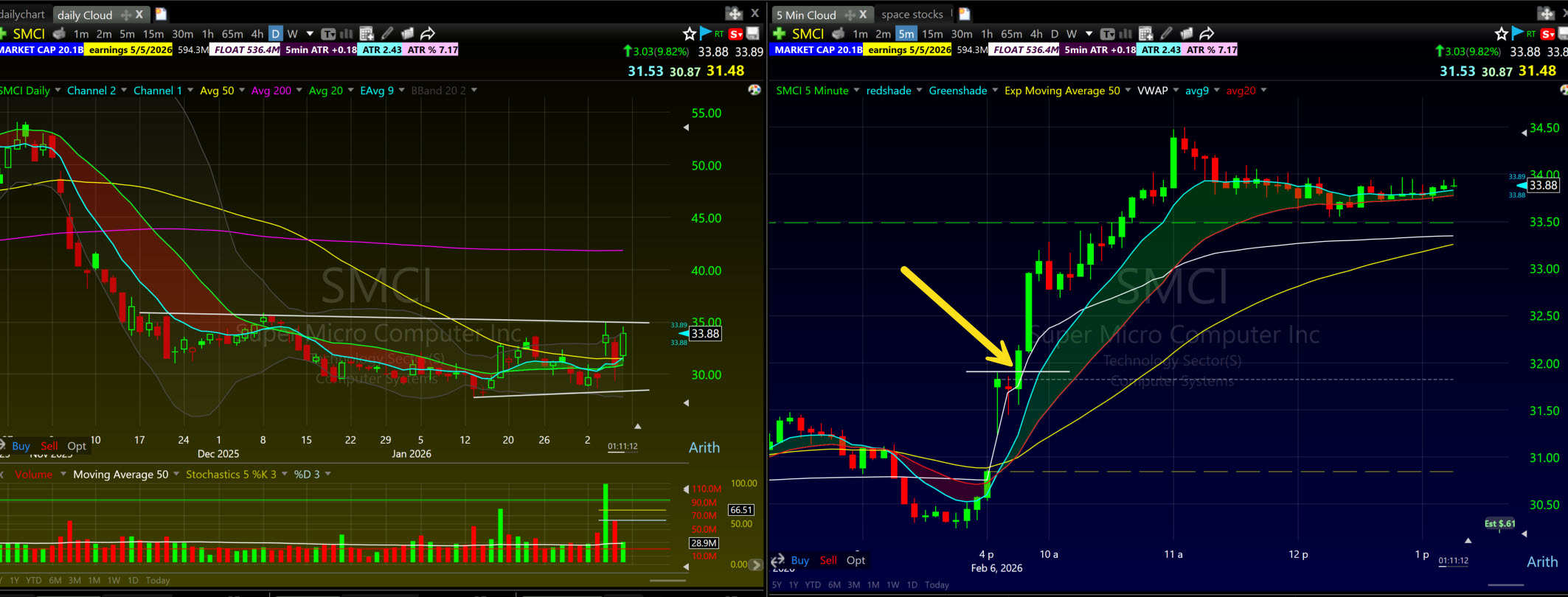 SMCI gapped up to $32 on news. On the 5-minute chart it formed a tight 3-candle consolidation — textbook lid. The Bone Zone curled up underneath. Candle 3 broke $32 on volume. Stop at VWAP. SMCI ran to $34+ with the Bone Zone holding the entire move.